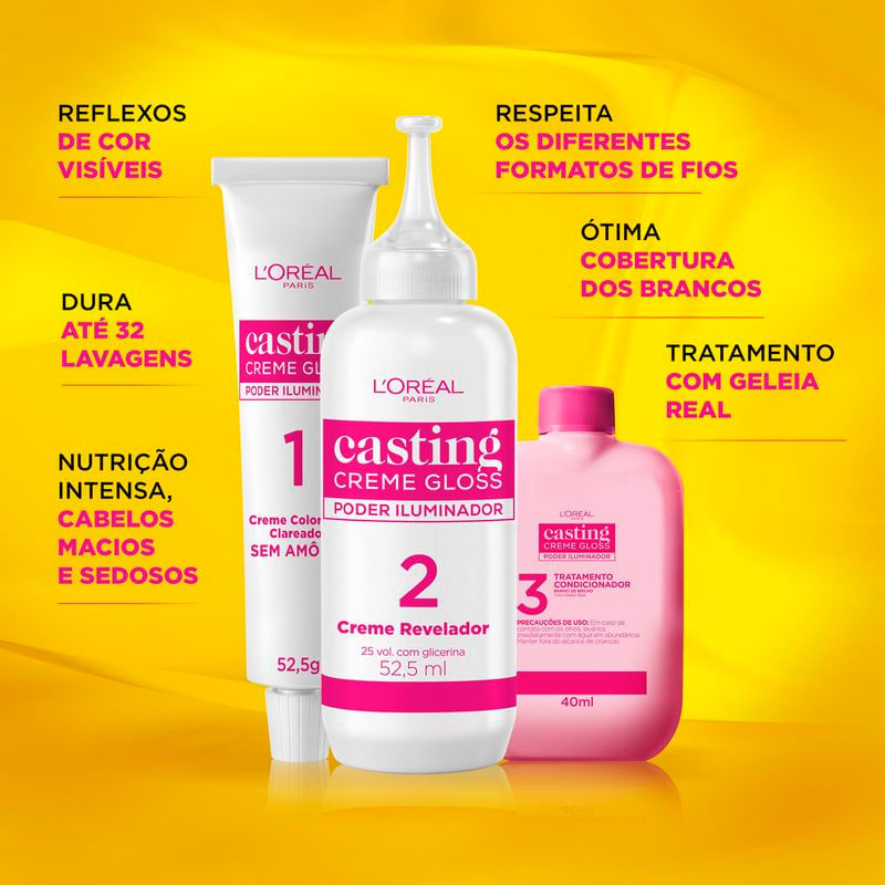 Casting Creme Gloss – Casting Creme Gloss de L’ Oréal Paris é a coloração sem amônia preferida das mulheres, que te dá uma cor incrível com brilho gloss, sem ressecar os fios e ainda pode ser usada em cabelos com química. Cabelos com defrisagem (alisamento/relaxamento), permanentes e escovas podem utilizar Casting Creme Gloss, basta esperar 15 dias entre os procedimentos e a coloração.